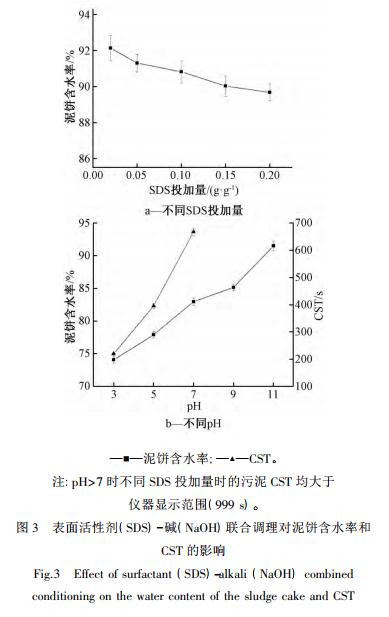 2. 3 表面活性劑( SDS) -堿( NaOH) 聯(lián)合調(diào)理對污泥脫水性能的影響