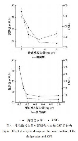 溶菌酶的等電點在 11 左右,在污泥溶液中帶正電荷,能與呈電負性的污泥膠體顆粒相互作用而促進微生物細胞壁水解,釋放結(jié)合水。但溶菌酶減弱了 EPS 與微生物間的黏附作用,破壞污泥絮體結(jié)構(gòu),使污泥沉降性能下降,污泥 CST 相對偏大。使用蛋白酶調(diào)理污泥時,蛋白酶能夠催化裂解細胞結(jié)構(gòu),并水解細胞釋放出的及污泥中原有的蛋白質(zhì),因而其對污泥脫水性能的強化作用優(yōu)于溶菌酶。實驗結(jié)果表明,過量的酶并不能提高污泥脫水性能,可能是由于酶促反應(yīng)在此底物污泥濃度下達到“飽和”。