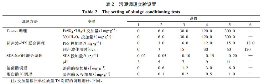 分別量取 50 mL 污泥樣品,對其先后進行不同方式的調(diào)理( 表 2) 。其中,Fenton 調(diào)理和 SDS-NaOH 聯(lián)合調(diào)理實驗將污泥樣品置于磁力攪拌機上攪拌 1 h,超聲波-PFS 聯(lián)合調(diào)理實驗時超聲波頻率為 40 kHz,溶菌酶調(diào)理和蛋白酶 K 調(diào)理實驗將污泥樣品恒溫水浴并攪拌 1 h,取出后進行污泥泥餅含水率和 CST 的測定。